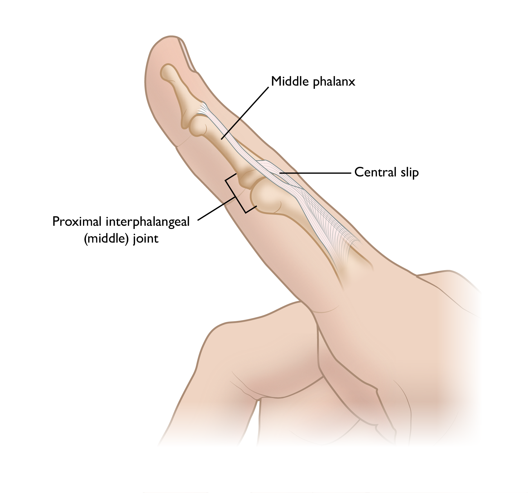 - A forceful blow to the top (dorsal) side of a bent (flexed) middle joint of a finger, causing rupture of the central slip or fracture of the bone where the central slip connects to the middle bone of the finger (middle phalanx).