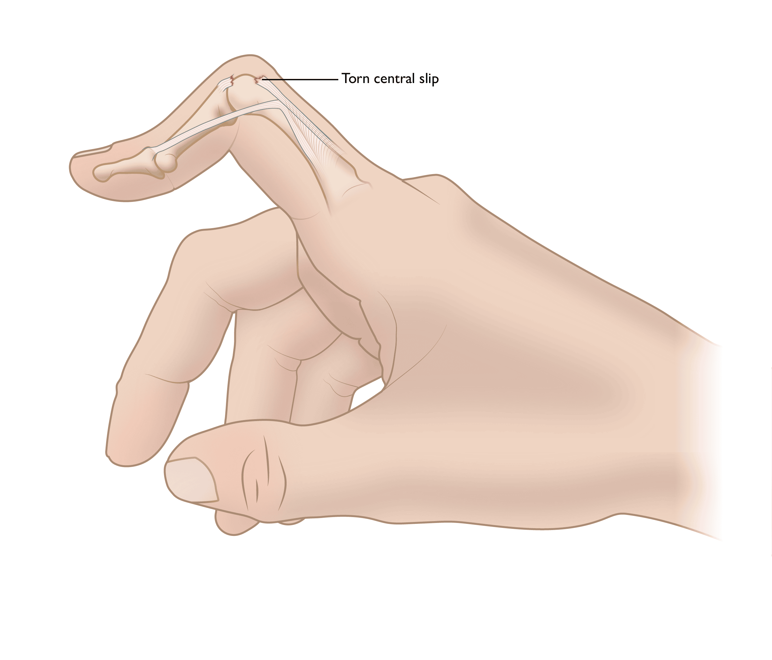 - A dislocation of the middle phalanx toward the bottom of the finger, causing the central slip to tear off of the bone.