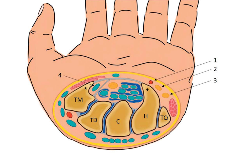 On the opposite side of the hook of the hamate (small finger side), the ulnar artery and ulnar nerve pass closely by.