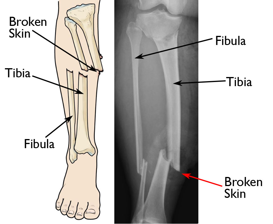- A complicated open fracture (also known as a compound fracture); with an open fracture, there is an open wound near the fracture, usually caused by a piece of bone breaking through the skin
