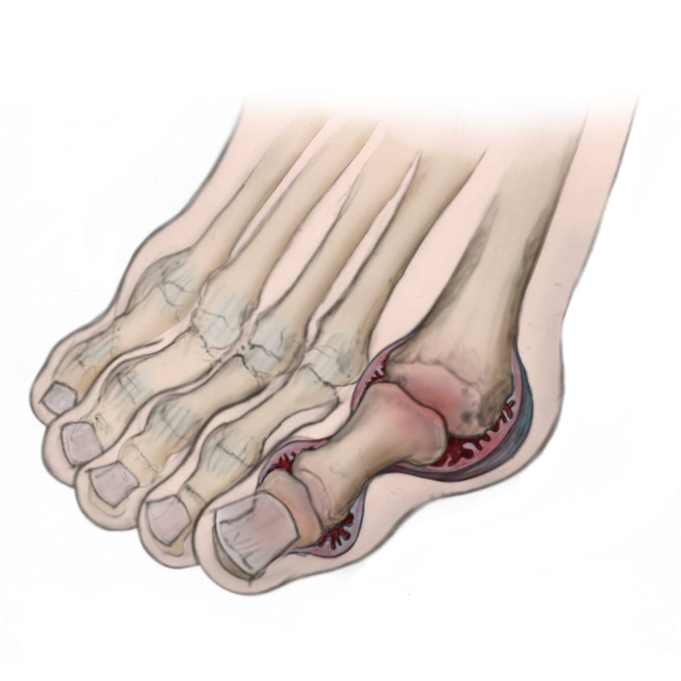 - If the RA has progressed and the lesser toes (2 through 5) have dislocated, a complex operation to minimize the pain and restore the shape of the foot may be recommended. The operation involves fusion of the big toe and removing a portion of bone of each of the metatarsals. This surgery removes the prominent bone on the bottom of the foot that is a source of the pain and allows the toes to re-align into a better position.