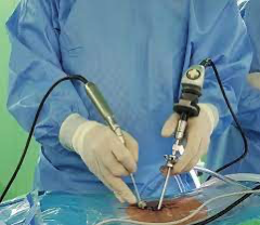 - The surgeon inserts a guide wire through the incision and carefully guides the wire toward the affected disk with the help of fluoroscopic (X-ray) guidance. The endoscope, which is attached to a camera, is then threaded over the guide wire and into the area of the herniated disk.