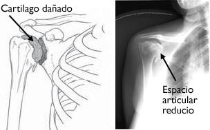 Los rayos X de un hombro artrítico mostrarán un estrechamiento en el espacio articular, cambios en el hueso y la formación de espolones óseos (osteofitos).
