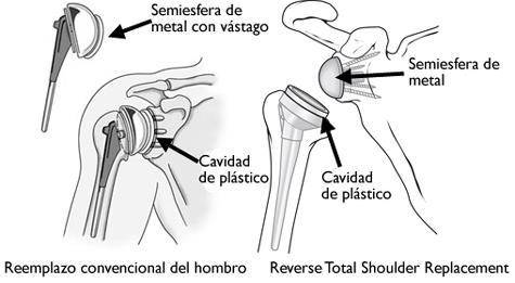 - Artroplastia total inversa del hombro. En un reemplazo total inverso del hombro, la cavidad y la semiesfera de metal son opuestas a una artroplastia total convencional de hombro. La semiesfera de metal se fija a la cavidad glenoidea, y la cavidad (copa) de plástico se fija al extremo superior del húmero. Un reemplazo total inverso del hombro funciona mejor para personas con artropatía por desgarro del manguito porque se sustenta en músculos diferentes -no en el manguito rotador- para mover el brazo.