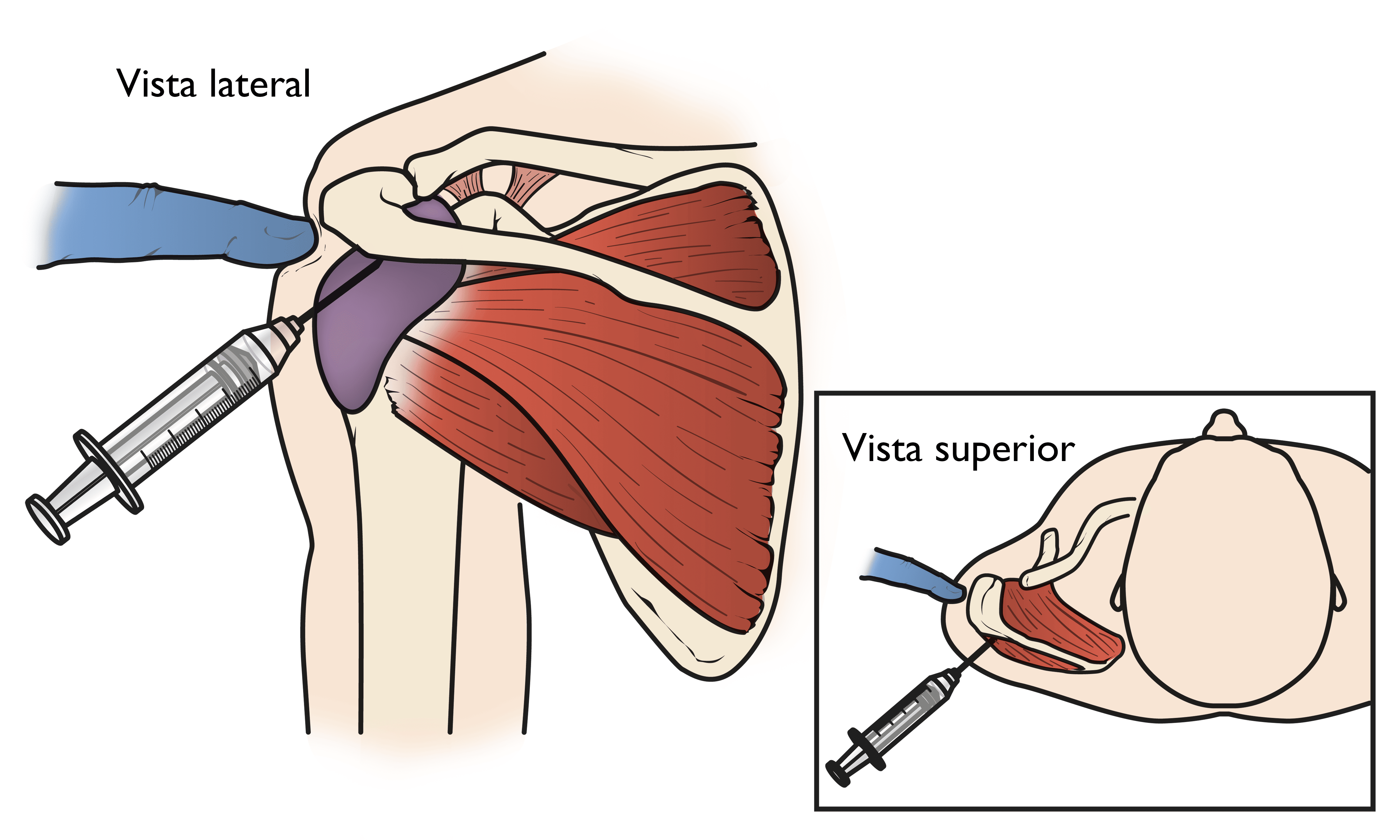 Inyección de esteroides. Si el descanso, los medicamentos y la fisioterapia no alivian el dolor, puede ser útil aplicar una inyección de anestesia local y una preparación de cortisona. La cortisona es un medicamento antiinflamatorio muy eficaz. Inyectarla en la bursa debajo del acromion puede aliviar el dolor.