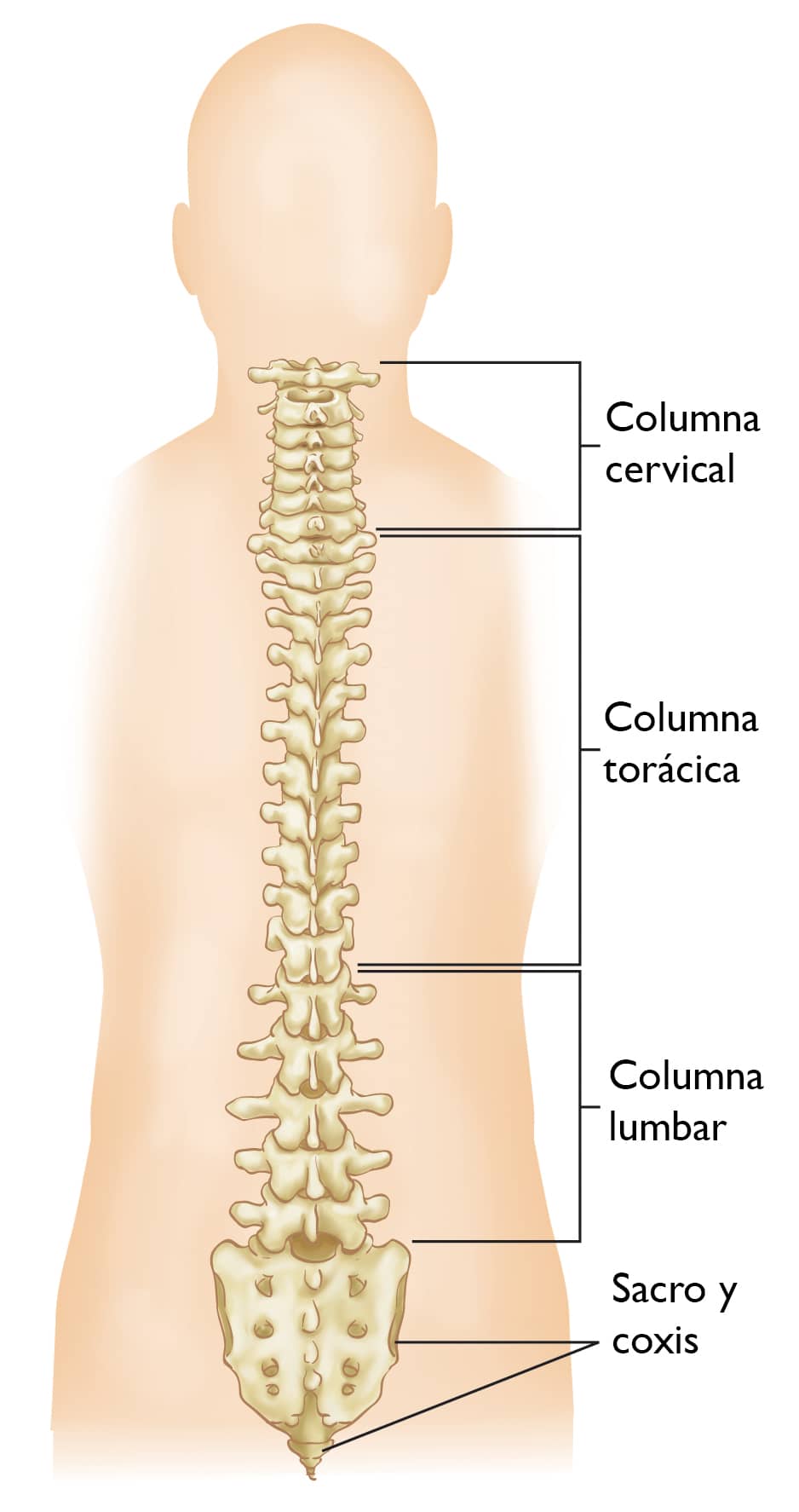 La columna cervical está compuesta por siete vértebras pequeñas que comienzan en la base del cráneo y terminan en la parte superior del pecho. La columna torácica está compuesta por 12 vértebras que comienzan en la parte superior del pecho, van hasta la parte media de la espalda y se conectan con la caja torácica. Las vértebras lumbares están compuestas por cinco vértebras más grandes, cuyo tamaño se debe a que soportan una mayor parte del peso del cuerpo.
