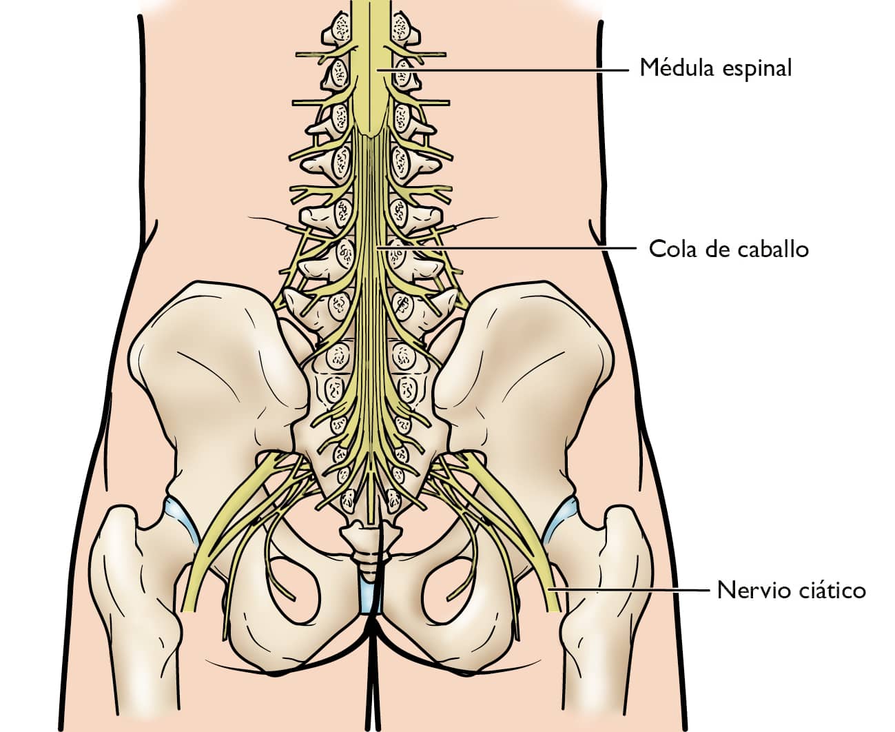La médula espinal termina alrededor de la primera y la segunda vértebra lumbar en la parte baja de la espalda y continúa en forma de raíces nerviosas. Este conjunto de raíces nerviosas se denomina “cola de caballo”. Estas raíces salen del canal de la columna vertebral a través de las aberturas de las vértebras (el foramen), al igual que las demás raíces nerviosas. En la pelvis, algunos de los nervios se agrupan en el nervio ciático, que se extiende a lo largo de la pierna.