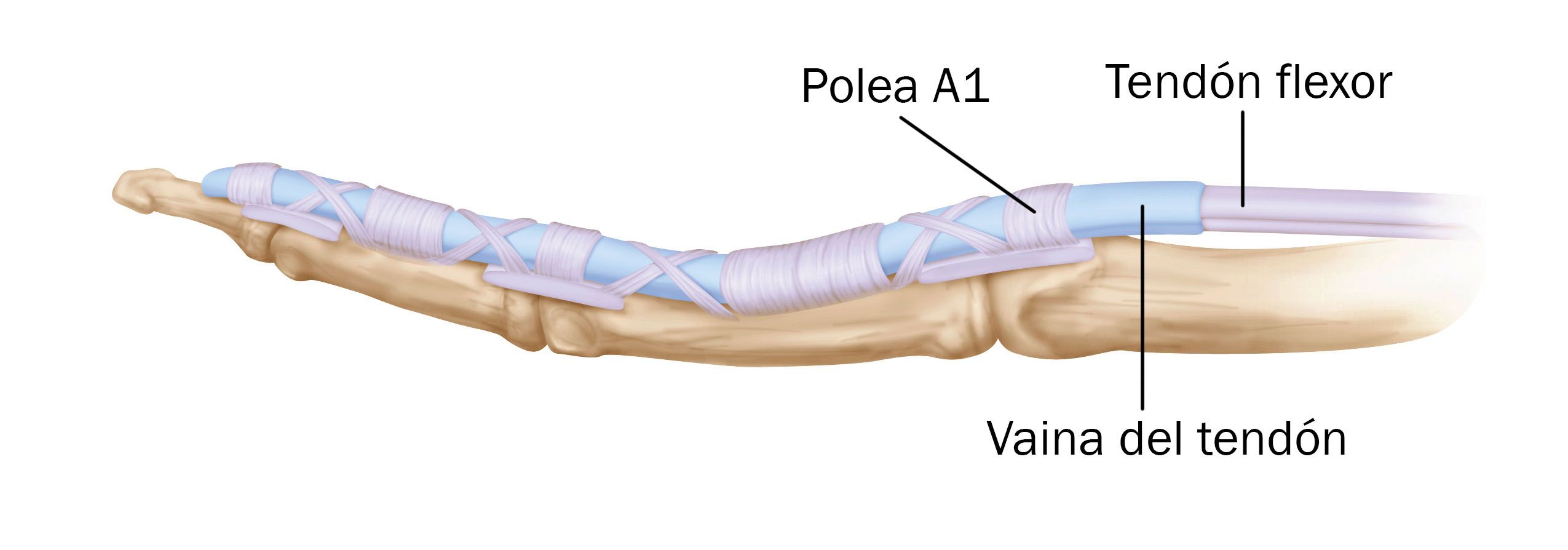 A lo largo de la vaina del tendón, bandas de tejido llamadas “poleas” sostienen los tendones flexores cerca de los huesos de los dedos. Los tendones pasan a través de las poleas a medida que se mueve el dedo. La polea en la base del dedo se llama “polea A1.” En la mayoría de los casos, esta es la polea afectada en el dedo en gatillo.