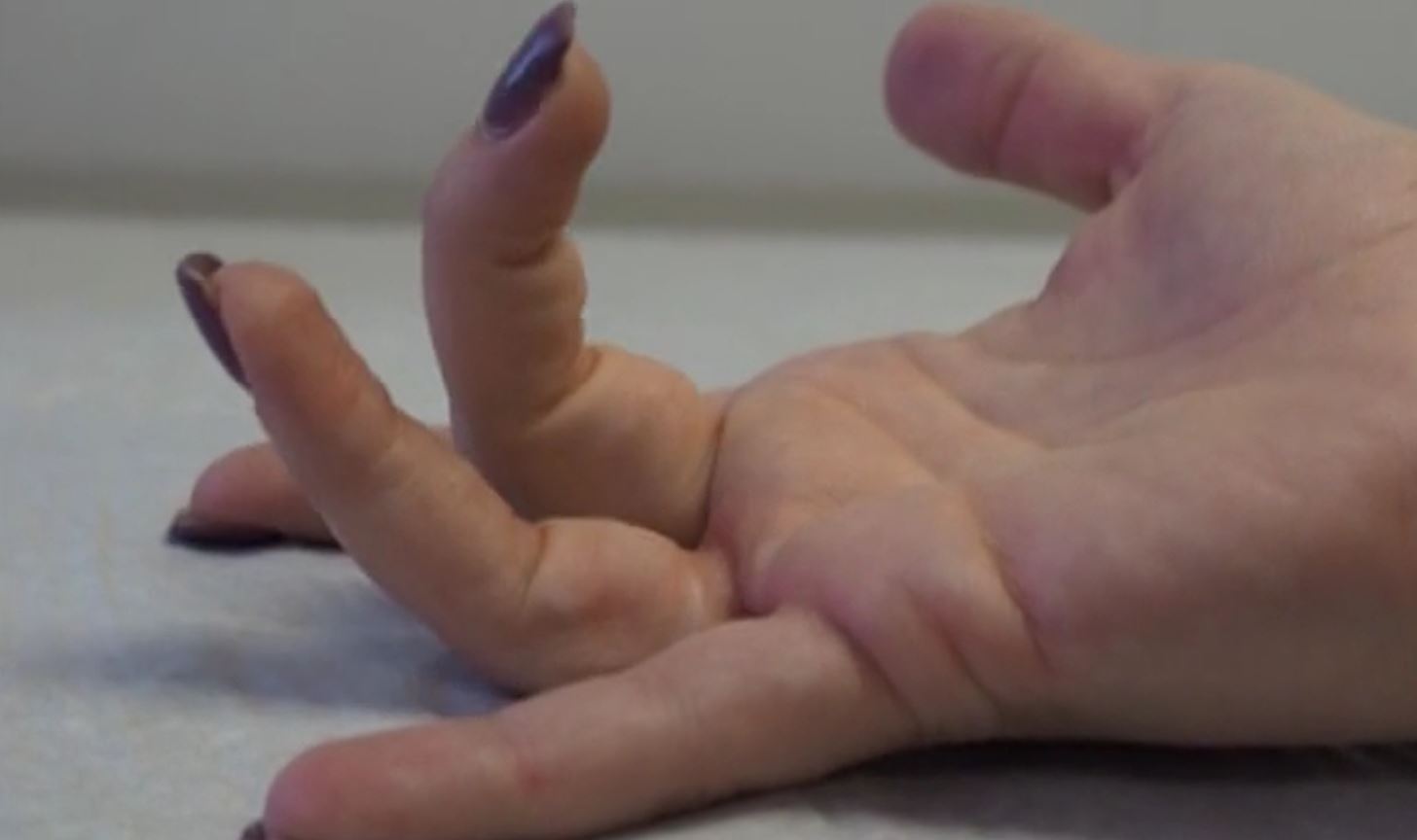 En un caso grave de dedo en gatillo, el dedo se traba y atora en la posición flexionada. A veces, el paciente debe usar la otra mano para estirar el dedo.