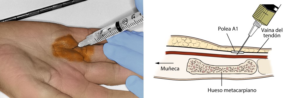 Inyecciones de esteroides. El corticoesteroide (como la cortisona) es un agente antiinflamatorio que se puede inyectar en la vaina del tendón, en la base del dedo en gatillo. Una inyección de esteroides puede evitar que el dedo quede en la posición de apretar un gatillo durante un período que puede ser de un día o de varias semanas. Si los síntomas no mejoran con el transcurso del tiempo, se puede aplicar una segunda inyección. Si dos inyecciones no resuelven el problema, se puede considerar realizar una cirugía.