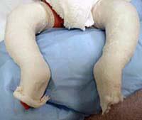 - Manipulación y uso de yeso. Se estira suavemente el pie de su bebé, se manipula para posicionarlo correctamente y se sostiene en su lugar con un yeso a la largo de la pierna (desde los dedos del pie hasta el muslo). Este proceso de estiramiento, reposicionamiento y enyesado se repite cada semana hasta lograr una gran mejoría en el pie. En la mayoría de los bebés, esta mejoría lleva alrededor de 6 a 8 semanas.