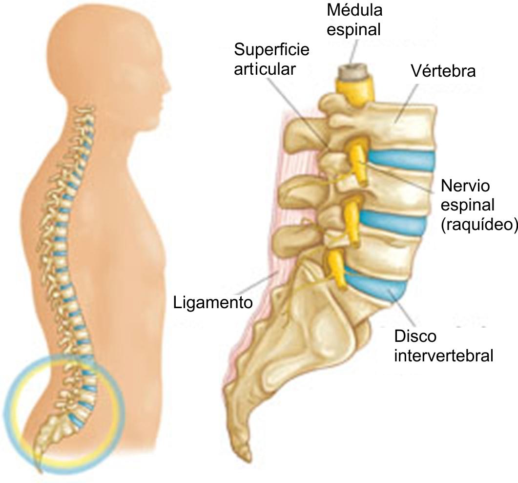 Su columna está compuesta de huesos pequeños, llamados vértebras, que están apilados uno sobre el otro. Los músculos, ligamentos, nervios y discos intervertebrales son partes adicionales de su columna.