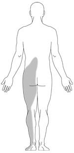 Dolor con ardor en los glúteos o las piernas (ciática). La presión en los nervios raquídeos puede resultar en dolor en las áreas inervadas por los nervios. El dolor podría describirse como una molestia intensa o una sensación de ardor. Típicamente comienza en el área de los glúteos y se irradia recorriendo la pierna. Al dolor que baja por la pierna a menudo se llama "ciática". A medida que avanza, puede resultar en dolor en el pie.