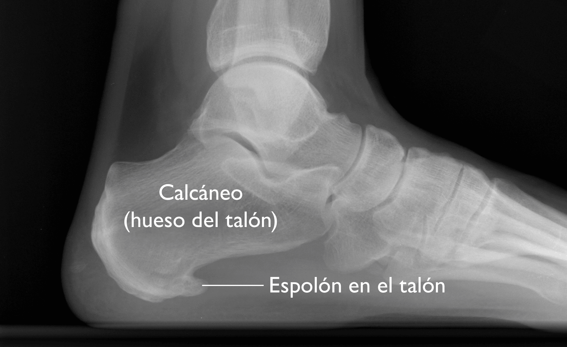 Los espolones en el tobillo también pueden verse en una radiografía. Un espolón en el talón puede ser el resultado de una tensión prolongada (que ocurre durante mucho tiempo) en la inserción de la fascia plantar (el punto en el hueso del talón donde se une la fascia plantar). Sin embargo, la mayoría de las personas que tienen espolones óseos en los talones no sienten dolor en el talón. Debido a que los espolones en el hueso del talón no son la causa de la fascitis plantar, el dolor de la fascitis plantar se puede tratar sin quitar el espolón.