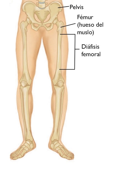 La parte recta y larga del fémur se denomina “diáfisis femoral”. La fractura en alguna parte de este hueso se denomina “fractura de la diáfisis femoral”. Casi siempre se requiere cirugía para reparar este tipo de fractura en la pierna.