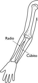 Los huesos del antebrazo son el radio y el cúbito. Si usted deja su brazo en posición natural a un lado del cuerpo, el cúbito es el hueso más cercano al cuerpo y el radio es el que está más hacia afuera.