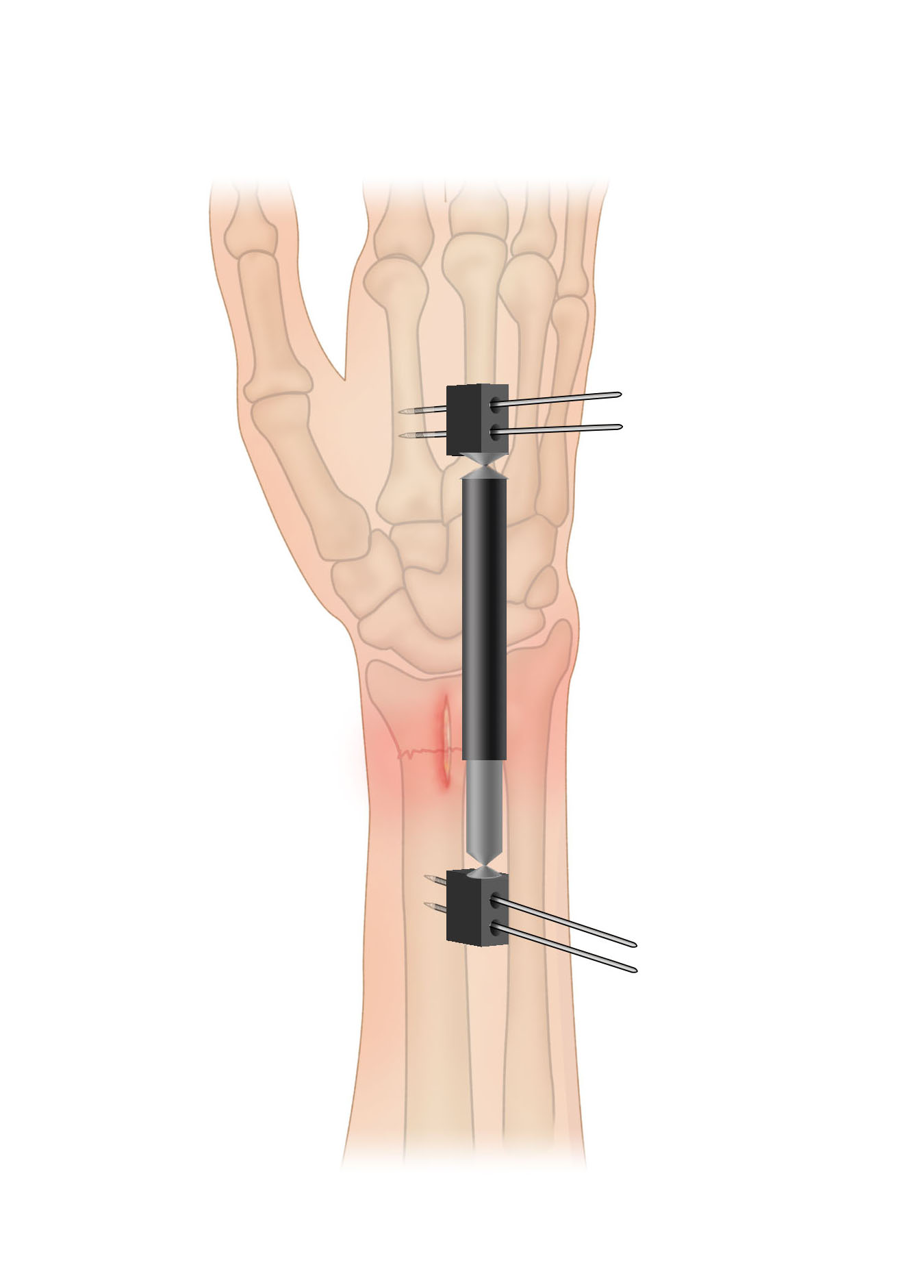 - Fijador externo (un marco de estabilización colocado fuera del cuerpo que mantiene los huesos en la posición correcta para que puedan consolidarse): este dispositivo se ha vuelto menos frecuente en los últimos años, pero sigue siendo una buena opción para las fracturas graves y expuestas.