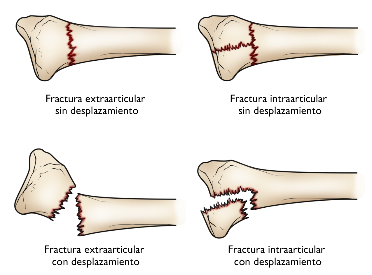 - Fractura intraarticular: Una fractura intraarticular se extiende hacia el interior de la articulación de la muñeca. (Articular significa “relativo a la articulación”).