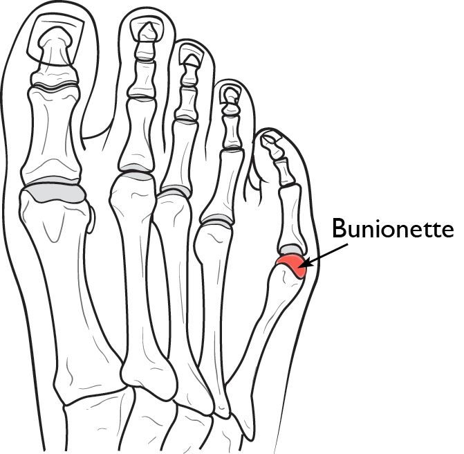 Un bunionette, o “juanete de sastre,” se presenta en la cara externa del pie, cerca de la base del dedo chico. Aunque es un sitio distinto del pie, un bunionette es muy similar a un juanete. Puede desarrollar bursitis dolorosa y endurecimientos o callos sobre el bulto.