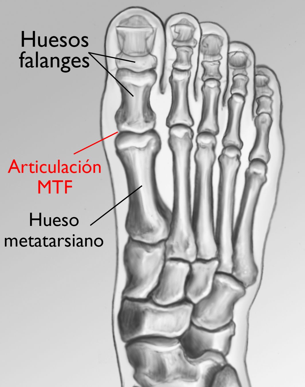 El dedo gordo está conformado por dos articulaciones. La más larga de las dos es la articulación metatarsofalángica (MTF), donde el primer hueso largo del pie (hueso metatarsiano) se une con el primer hueso del dedo (falange).