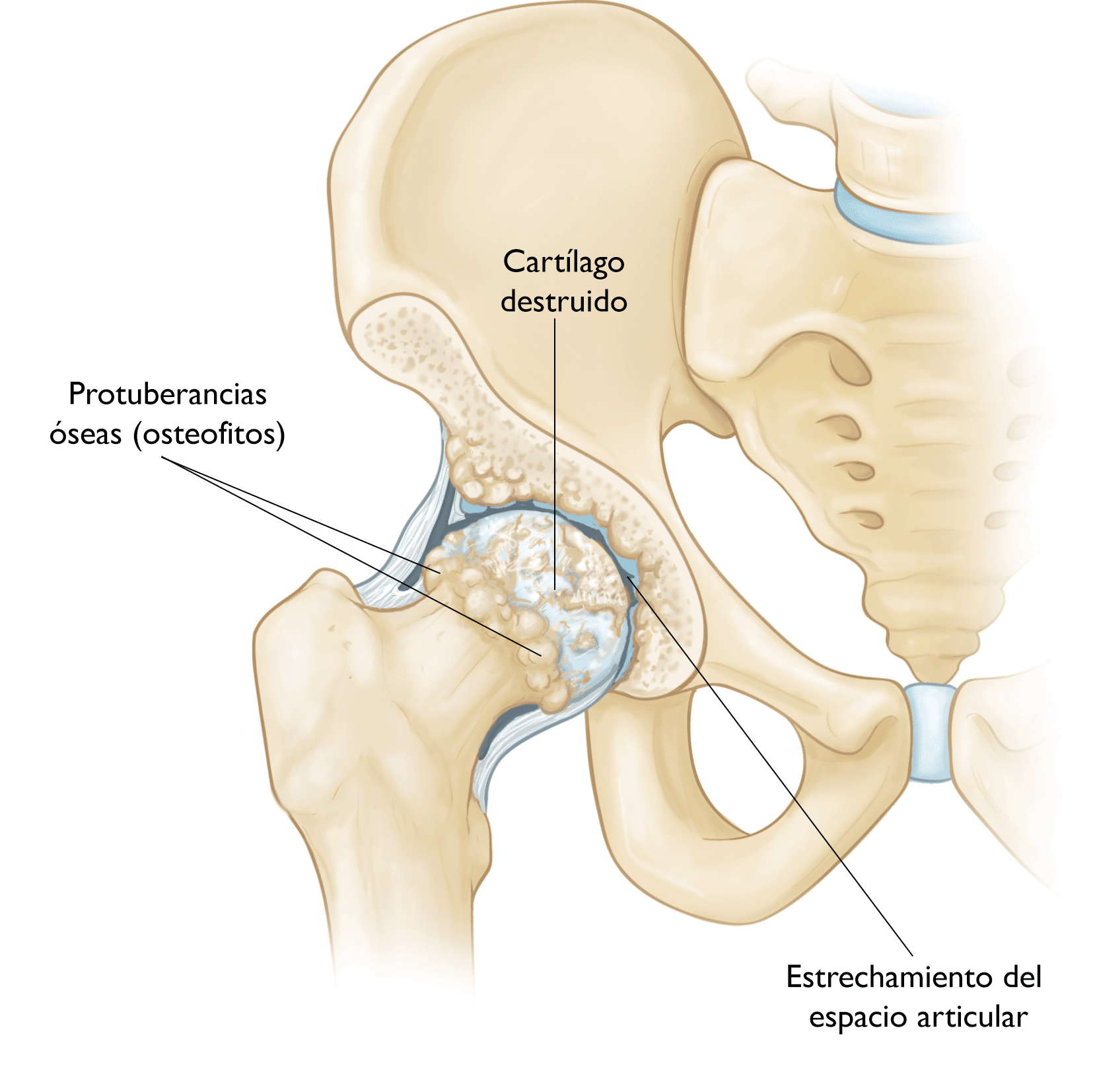 En la artrosis, el cartílago de la articulación de la cadera se desgasta gradualmente con el paso del tiempo. A medida que el cartílago se desgasta, se daña y vuelve más áspero, y disminuye el espacio articular que protege los huesos. Esto puede hacer que un hueso roce con el otro. Para compensar la pérdida de cartílago, los huesos dañados pueden comenzar a crecer hacia afuera y formar protuberancias óseas (osteofitos).