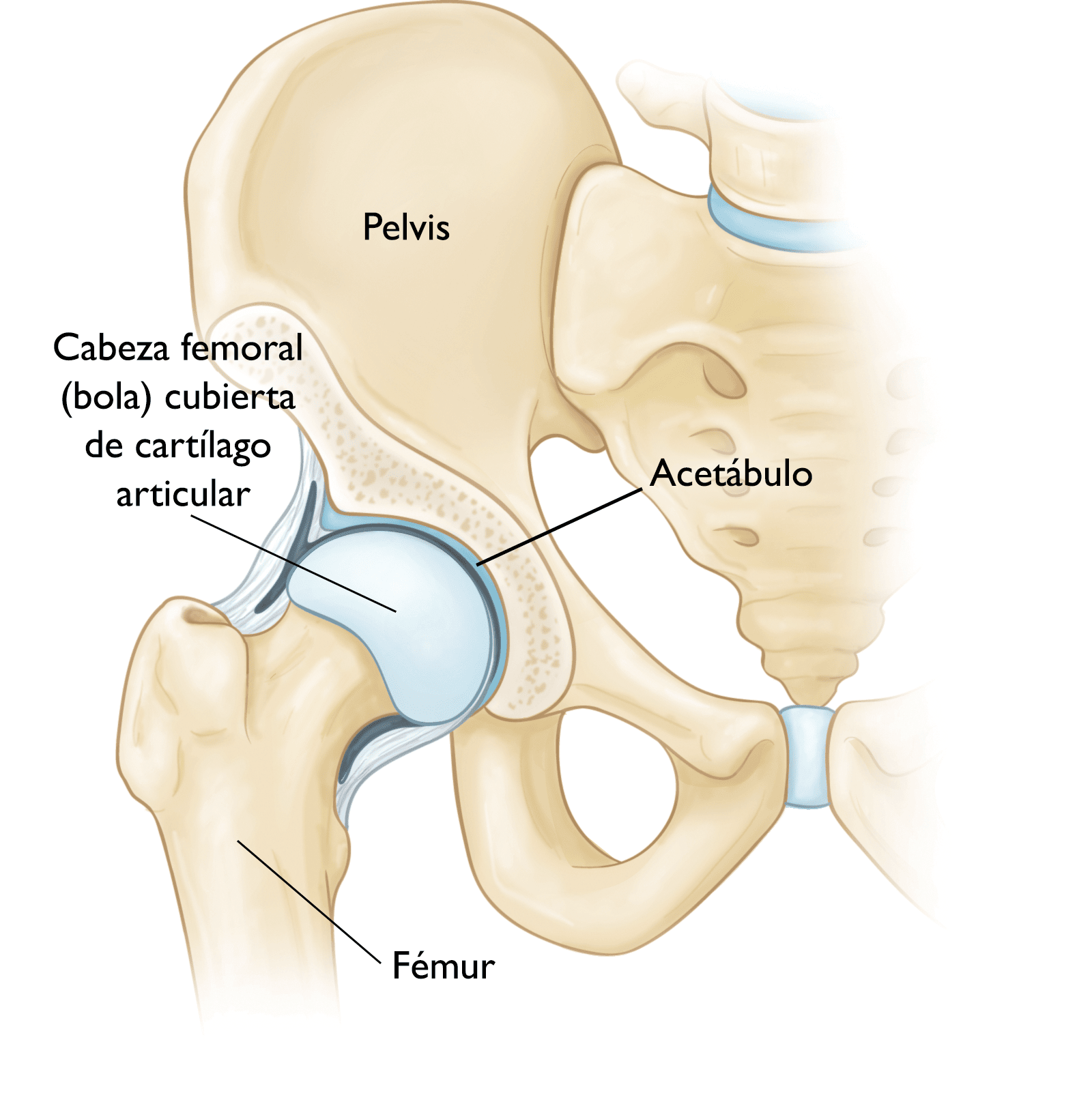 La cadera es una de las articulaciones más grandes del cuerpo. Es un tipo de “enartrosis”: está formada por una bola y una cavidad. La cavidad está formada por el acetábulo, que es parte del hueso grande de la pelvis. La bola es la cabeza femoral, que es el extremo superior del fémur.
