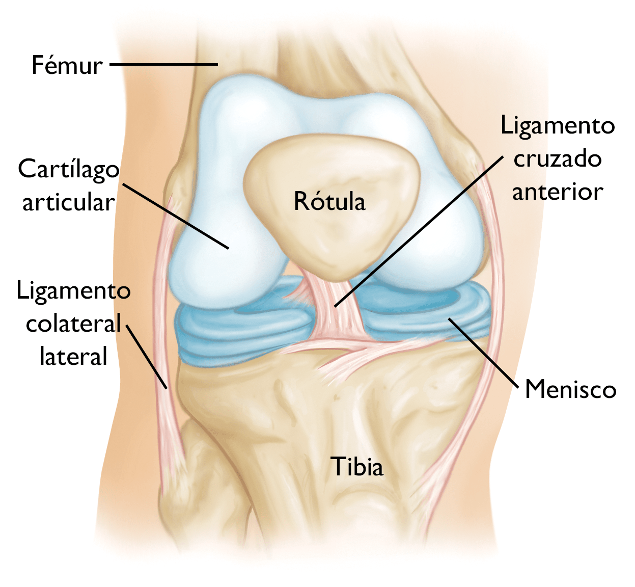 La rodilla está compuesta por el extremo inferior del hueso del muslo (fémur), el extremo superior de la espinilla (tibia), y la rótula. Los extremos de estos tres huesos están recubiertos por el cartílago articular, una sustancia suave que protege los huesos y les permite moverse con facilidad en la articulación.