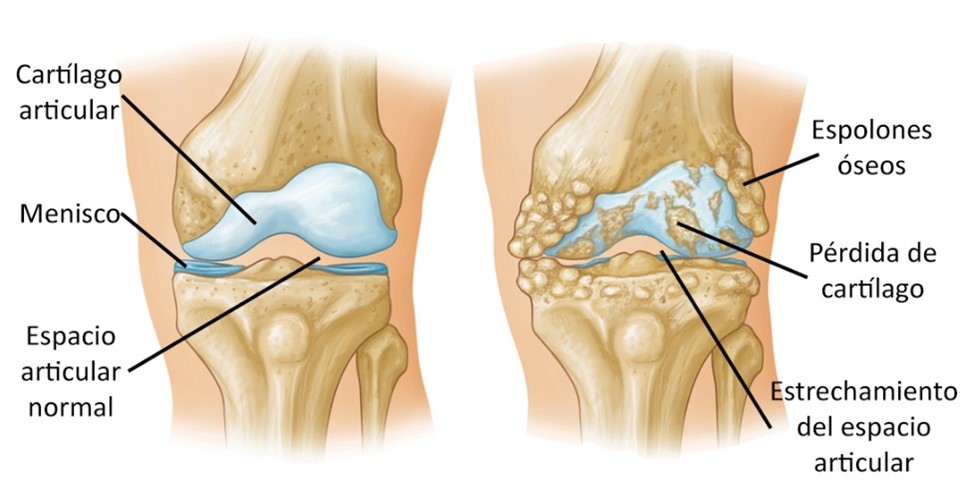 - Osteoartritis. Este es un tipo de artritis relacionada con la edad y el desgaste. Por lo general, ocurre en personas mayores de 50 años, pero también puede ocurrir en personas más jóvenes. El cartílago que protege los huesos de la rodilla se ablanda y se desgasta. En consecuencia, los huesos se rozan entre sí, lo que provoca dolor y rigidez en la rodilla.